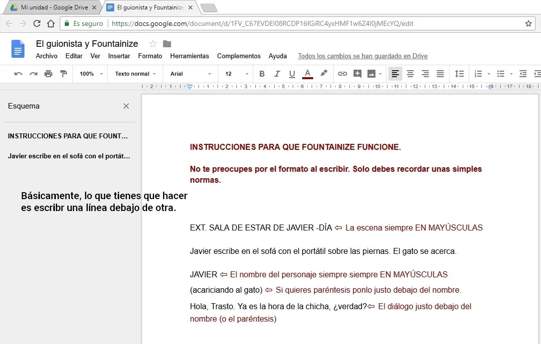 - Te despreocupas de dar formato durante la escritura. (El formato lo aplicas más tarde, de forma automática, con el complemento FOUNTAINIZE).