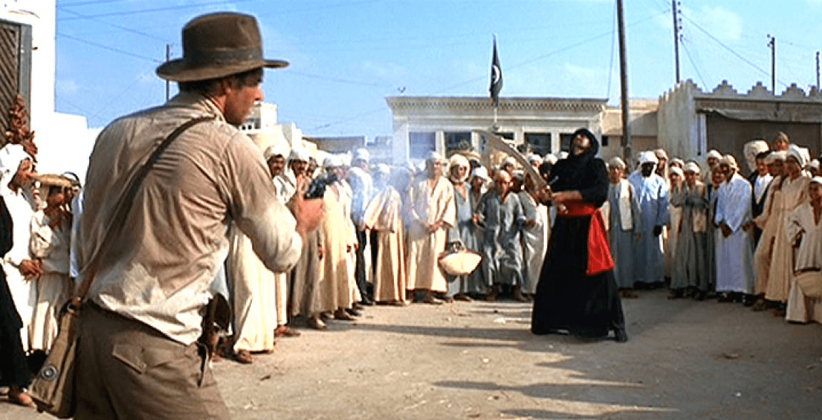 Harrison Ford, agotado e indispuesto por un virus estomacal, decidió que con el disparo podría cerrar la escena y marcharse a descansar. Así fue como se creó una memorable y simple escena —¡una solución elegante!— de En busca del Arca perdida.